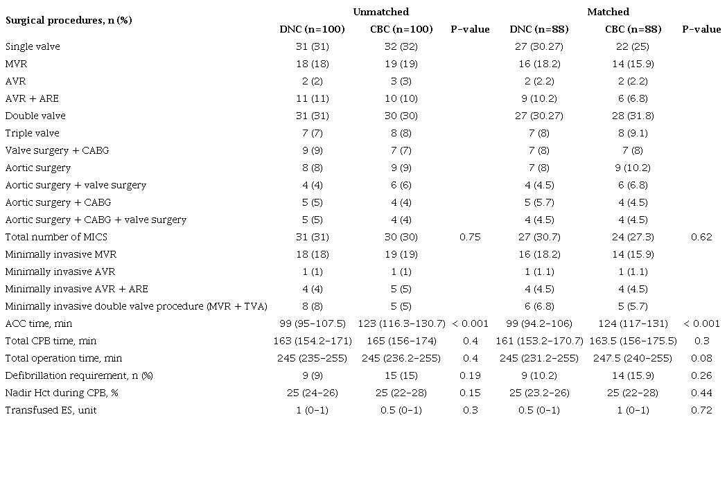 Secondary endpoints were postoperative clinical outcomes, CBP and ACC times, and usage of blood products.