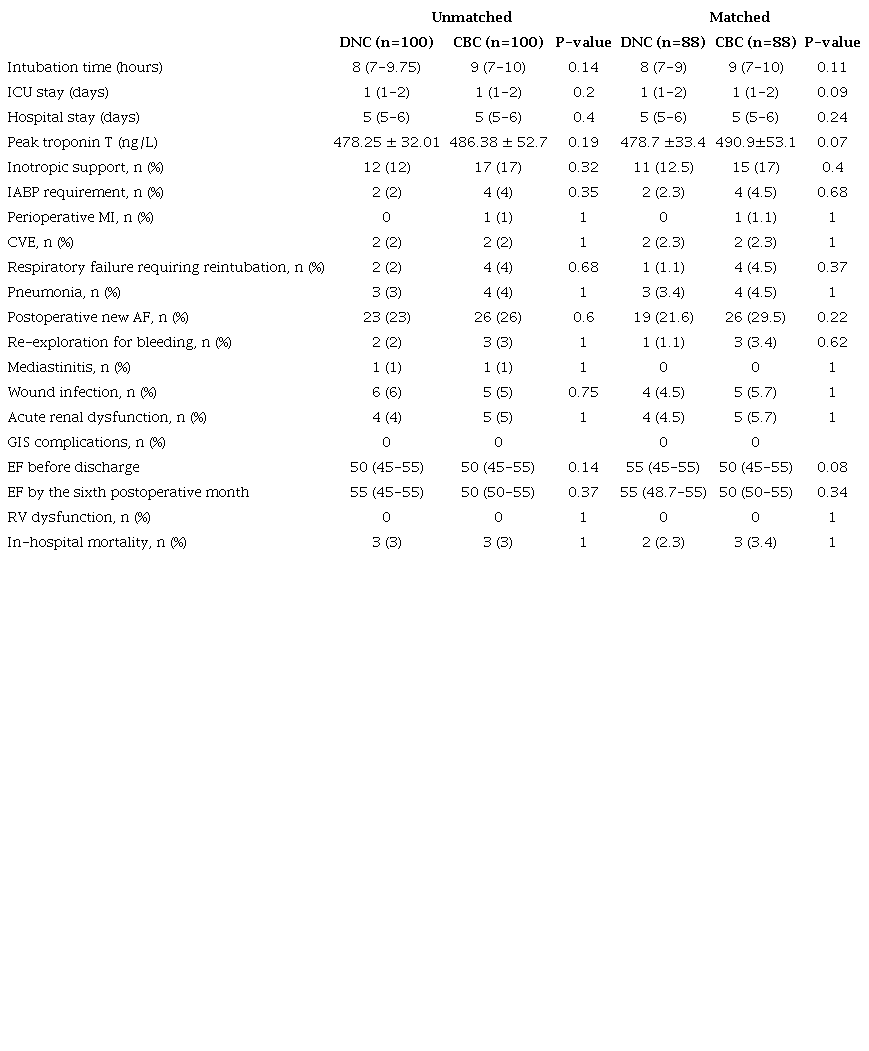 There were no significant differences when comparing the two groups regarding the requirement for intraoperative defibrillation (10.2% vs. 15.9%; P=0.26), postoperative peak troponin T levels (478.7 ±33.4 vs. 490.9±53.1; P=0.07), perioperative inotropic support (12.5% vs. 17%; P=0.4), intra-aortic balloon pump (IABP) requirement (2.3% vs. 4.5%; 0.68), and postoperative LVEF at discharge (55 [45-55] vs. 50 [45-55]; P= 0.08) and on the postoperative sixth month (55 [48.7-55] vs. 50 [50-55]; P=0.34).
