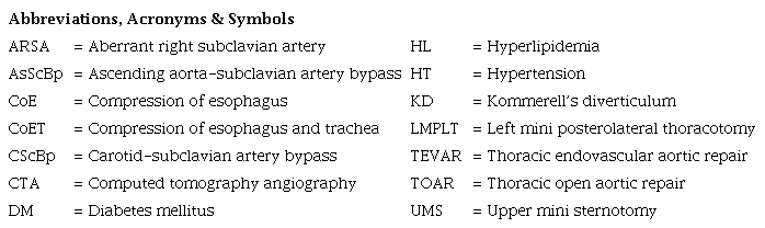 Results: Median age of the patients (7 females/4 males) was 55 years (range 49 - 62). The first four patients (36.4%) underwent hybrid repair using thoracic endovascular aortic repair (TEVAR) and bilateral carotid-subclavian artery bypass (CScBp). Three patients (27.2%) were treated by open ARSA resection/ligation with left mini posterolateral thoracotomy (LMPLT) and right CScBp. And the last four patients (36.4%) underwent ARSA resection/ligation with LMPLT and ascending aorta-right subclavian artery bypass with upper mini sternotomy (UMS). Two of the four patients who underwent TEVAR + bilateral CScBp had continuing dysphagia cause of persistent esophageal compression. Brachial plexus injury developed in one of three patients who underwent LMPLT + right CScBp. Pleural effusion treated with thoracentesis alone was observed in one of four patients who underwent UMS + LMPLT.