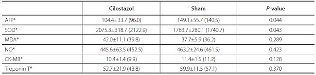 In all Wistar rats, the experiment was completed in accordance with the protocol. The mean level of ATP was 104.4 in the cilostazol group and 149.1 in the sham group (P=0.044). In contrast, SOD level was significantly higher in the cilostazol group than in the sham group (2075.3 vs. 1783.7, P=0.043). MDA, NO, CK-MB, and cTnT levels were similar between the cilostazol group and the sham group (P=0.289, P=0.423, P=0.128, and P=0.370, respectively) (Table 1).