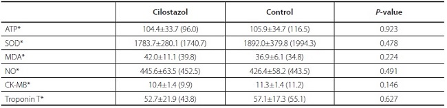 Methods: The study was conducted with three groups of 10 Wistar rats (control group, rats without any coronary ischemia; sham group, rats with coronary ischemia but without cilostazol administration; and cilostazol group, rats with coronary ischemia and cilostazol administration). The level of myocardial injuries was measured by analyzing cardiac troponin T and creatine kinase MB levels in blood samples. In tissue samples, adenosine triphosphate (ATP), nitric oxide, superoxide dismutase (SOD), and malondialdehyde were used to determine the amount of tissue damage. Tissues were stained with hematoxylin-eosin method, and samples were examined under light microscope.