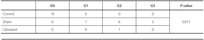 In the histopathological examination, all samples were classified as G0 in the control group. In the sham group, one sample was categorized as G1, six samples as G2, and three as G3. In the cilostazol group, nine samples were categorized as G1, and one as G2 (P=0.011) (Table 3).