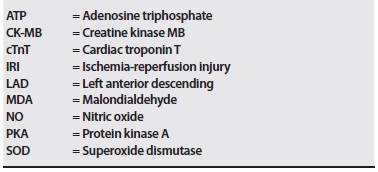 The level of myocardial injuries was measured by analyzing cardiac troponin T (cTnT) and creatine kinase MB (CK-MB) levels in blood samples. The amount of damage in tissue samples was determined by measuring adenosine triphosphate (ATP), nitric oxide (NO), superoxide dismutase (SOD), and malondialdehyde (MDA) levels.