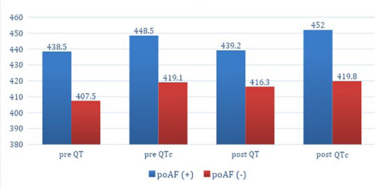 On the contrary, preoperative QT (P<0.001), preoperative QTc (P<0.001), postoperative QT (P=0.005), and postoperative QTc values were statistically significantly higher in the poAF (+) group compared to the poAF (-) group (Table 2, Figure 1).