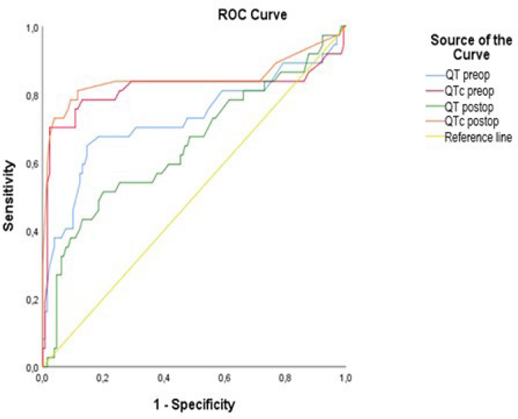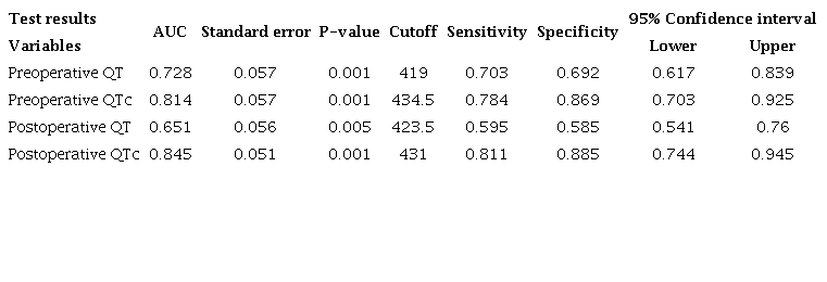 In the present study, we found that preoperative QT (cutoff: 419, sensitivity: 0.703, specificity: 0.692), preoperative QTc (cutoff: 434.5, sensitivity: 0.784, specificity: 0.869), postoperative QT (cutoff: 423.5, sensitivity: 0.595, specificity: 0.585), and postoperative QTc (cutoff: 419, sensitivity: 0.703, specificity: 0.692) were potential predictors of poAF. However, our results should be supported by larger series prospective studies.