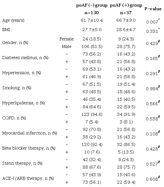 The present study included 167 consecutive patients who had no prior history of AF and underwent OPCAB. Thirty-seven of 167 patients (22.1%) developed AF before the discharge from the hospital in the postoperative period. Mean age was 66.7±9.0 years in the poAF (+) group and 61.7±10.4 years in the poAF (-) group. The mean age was statistically significantly higher in the poAF (+) group compared to poAF (-) group (P=0.007). Of the 37 patients who developed poAF, nine (24.3%) were female and 28 (75.7%) were male. Of the 130 patients without poAF, 24 (18.5%) were female and 106 (%81.5) were male. No significant difference was found between both groups in terms of gender distribution (P>0.05). In addition, there was no significant difference between the groups in terms of BMI (P>0.05). And no statistically significant difference was found between both groups in terms of frequency of comorbidities (diabetes mellitus, hypertension, hyperlipidemia, COPD, myocardial infarction, and smoking status) and drug use (beta blocker therapy, statin therapy, ACE-I/ARB therapy) (for all P>0.05) (Table 1).