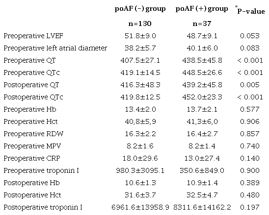 Results: PoAF was detected in 37 (22.1%) of 167 patients who underwent OPCAB surgery. When QT interval measurements were compared, preoperative and postoperative QT and corrected QT interval (QTc) values were significantly longer in the group with atrial fibrillation. Mean values of preoperative QT were 407.5±27.1 in the poAF (-) group vs. 438.5±48.5 in the poAF (+) group (P<0.001). Mean values of preoperative QTc were 419.1±14.5 in the poAF (-) group vs. 448.5±26.6 in the poAF (+) group (P<0.001). Mean values of postoperative QT were 416.3±48.3 in the poAF (-) group vs. 439.2±45.8 in the poAF (+) group (P=0.005). And mean values of postoperative QTc were 419.8±12.5 in the poAF (-) group vs. 452.0±23.3 in the poAF (+) group (P<0.001).