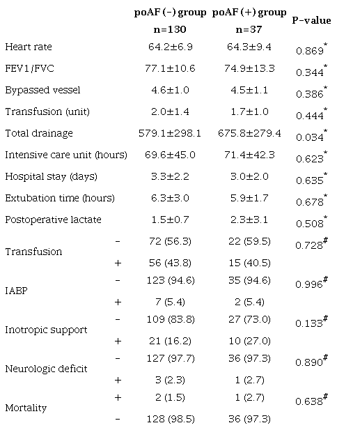 When operative and postoperative characteristics of CABG operations were evaluated, no statistically significant difference was found between poAF (+) and poAF (-) groups in terms of heart rate, forced expiratory volume in the first second/forced vital capacity, bypassed vessels, transfusion (unit), length of stay in ICU (hours), hospital stay (days), extubation time (hours), postoperative lactate, the need for transfusion, the presence of intra-aortic balloon pump, the need for inotropic support, neurologic deficit, and mortality (for all P>0.05). On the other hand, the amount of total drainage was statistically significantly higher in the poAF (+) group than in the poAF (-) group (P=0.034) (Table 3).