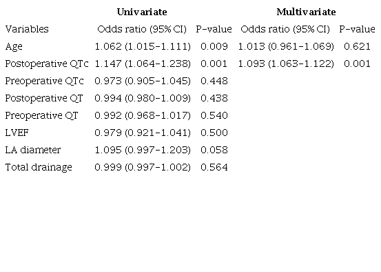 Risk factors for the development of poAF were evaluated by univariate logistic regression analysis. Age (odds ratio [95% confidence interval, CI] 1.062 [1.015-1.111], P=0.009) and postoperative QTc (odds ratio [95% CI] 1.147 [1.064-1.238], P=0.001) were detected to be significantly higher for poAF. In multivariate logistic regression analysis, only postoperative QTc was found to be an independent predictor for the development of poAF (odds ratio [95% CI] 1.093 [1.063-1.122], P=0.001) (Table 4).