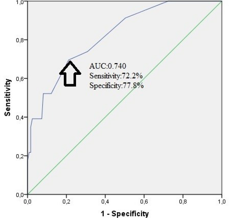 The multivariate logistic regression analysis revealed that age (OR: 7.486, 95% CI: 1.995-28.081, P=0.003), anaemia (OR: 1.634, 95% CI: 1.167-2.405, P=0.016), LVEF (OR: 0.385, 95% CI: 0.270-0.825, P=0.017), Killip class (OR: 6.382, 95% CI: 2.091-14.505, P=0.017), and IG count (OR: 5.003, 95% CI: 1.426-7.557, P<0.001) were the independent predictors of in-hospital mortality (Table 3). Furthermore, in ROC curve analysis, the IG count was shown to predict in-hospital mortality with a sensitivity of 72.2% and specificity of 77.8% at a cut-off value of 0.65 (area under the curve: 0.740, 95% CI: 0.635-0.846, P<0.001, Figure 1).
