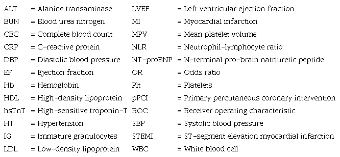 This study has several limitations. First, it was designed as a single-centre, retrospective study. Second, the time elapsed from the onset of symptoms to the time of sampling and the time from diagnosis of STEMI to pPCI were not analysed, which might have affected our results. Lastly, serial IG counts could not be performed, and IG counts could not be compared with the levels of some inflammatory parameters such as tumour necrosis factor and interleukin 6. There is a need for prospective multi-centre studies to show that the IG count can be used as a prognostic marker in patients with STEMI.