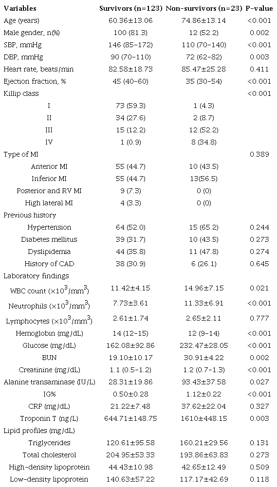 A total of 146 patients who met the inclusion criteria were included in the study. Of these patients, 112 (76.7%) were men and 34 (33.3) were women. The mean age of the patients was 62.65±14.06 years. Mean ejection fraction (EF) was 44% (30-52%), mean systolic blood pressure (SBP) was 140 (80-160), and mean diastolic blood pressure (DBP) was 85 (60-95). Seventy-four (50.7) patients met the class I criteria according to the Killip classification. The most common myocardial infarction (MI) types were inferior (46.6%) and anterior (44.5%) MI in decreasing order of frequency. Hypertension, dyslipidaemia and diabetes were the most common risk factors. The mean WBC count was 11.98±4.89. The mean CRP and IG values were 35.16±18.75 and 0.61±0.51, respectively. Table 1 presents the baseline clinical characteristics of patients with STEMI. When patients were divided into groups according to in-hospital mortality, 123 (84.2%) were in the survivor group and 23 (15.8%) were in the non-survivor group. The mean age of patients was found to be significantly higher in the non-survivor group (74.86±13.14 vs. 60.36±13.06, P<0.001). The number of male patients was significantly higher in the survivor group (P=0.002). Mean SBP, DBP, heart rate (HR) values and the percentage of patients in Killip class I were significantly higher in the survivor group compared to the non-survivor group (P<0.05 for all markers). Mean WBC, neutrophils, glucose, blood urea nitrogen (BUN), creatinine, alanine transaminase (ALT) and troponin levels were significantly higher but the mean haemoglobin levels were significantly lower in non-survivors compared to survivors (P<0.05 for all markers). Mean IG counts were significantly higher in non-survivors compared to survivors (1.12±0.22 vs. 0.50±0.28, P<0.001). The comparison of demographic data and laboratory values between groups are presented in Table 1.