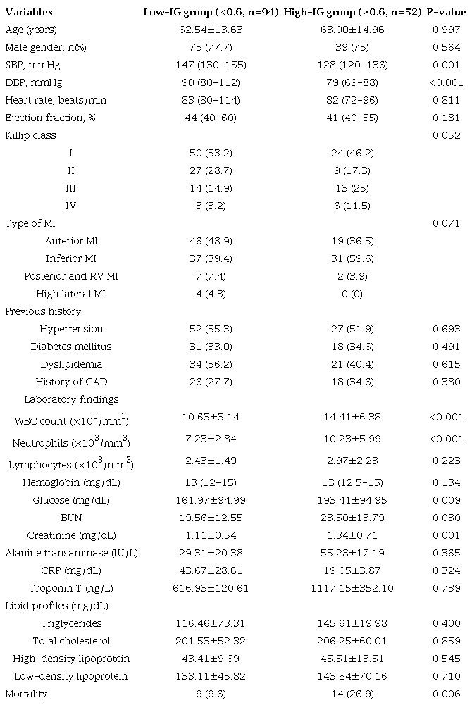 When patients were divided into two groups as those with low (<0.6) and high (≥0.6) IG counts, it was observed that there were 94 (64.3%) and 52 (35.7%) patients in the low and high IG groups, respectively. Patients with high IG counts had significantly lower SBP and DBP values. Laboratory analysis results showed that patients in the high IG count group had significantly higher WBC (14.41±6.38 vs. 10.63±3.14, P<0.001), neutrophil (10.23±5.99 vs. 7.23±2.84, P<0.001), glucose (193.41±94.95 vs. 161.97±94.99, P=0.009), BUN (23.50±13.79 vs. 19.56±12.55, P=0.03) and creatinine (1.34±0.71 vs. 1.11±0.54, P=0.001) levels compared to the low IG count group. Furthermore, mortality rates were significantly higher in the high IG count group compared to the low IG count group (26.9% vs. 9.6%, P=0.006) (Table 2).