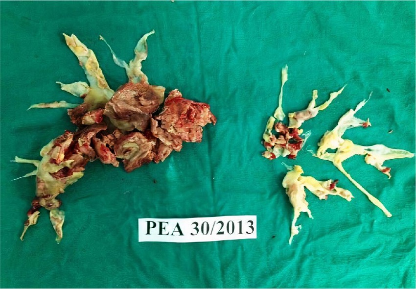 The ideal layer can be easily peeled and seen as a pearl white. There should be no traces of yellow plaque. If the dissecting flap is deep, the reddish or pink appearance will indicate adventitia. When a full layer is obtained in the correct plan, endarterectomy is performed by the eversion technique. The whole specimen is “tail-shaped” and must be freely reduced (Figure 1). The left-sided endarterectomy process has almost similar characteristics to the right side in terms of applicability. Total circulatory arrest time is identical too. After the surgical procedures were completed, the rewarming time was planned to be 90-120 minutes. The temperature did not exceed 37 °C.