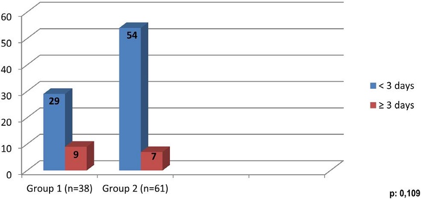 Statistically, there was no difference between the two groups in terms of demographic data. In general, there was no statistically significant difference between the two groups compared to the mortality rates of their groups (P>0.05). When the effect of fluid therapy on the ventilatory-assisted period was examined, there was no statistically significant difference between the two groups (P>0.05) (Figure 2). The length of stay in the intensive care unit (ICU) of the patients in both groups was examined. The mean duration of stay in the ICU for Group 1 patients was 6.2 days, and the mean duration for Group 2 patients was 5.4 days. There was no statistically significant difference between the groups (P>0.05). After discharge from the ICU, the readmission rate to the ICU for respiratory or non-respiratory reasons was 8.3% (n=4) in Group 1 patients and 11.7% (n=9) in Group 2 patients. These rates are not statistically significant (P>0.05). The total length of hospital stay in Group 1 is 11.6 days and in Group 2 is 16.1 days. This difference was statistically significant (P<0.05).