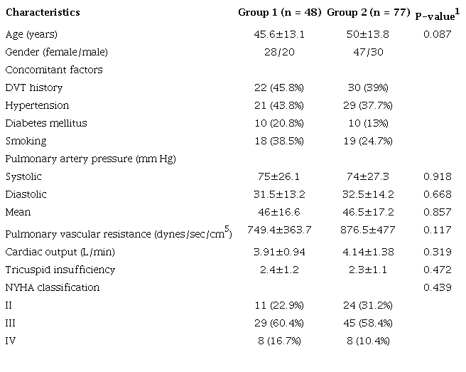 Methods: One hundred twenty-five patients who were diagnosed with CTEPH and underwent pulmonary thromboendarterectomy (PTE) at our center between February 2011 and September 2013 were included in this retrospective study with prospective observation. They were in New York Heart Association functional class II, III, or IV, and mean pulmonary artery pressure was > 40 mmHg. There were two groups, the crystalloid (Group 1) and colloid (Group 2) liquid groups, depending on the treatment fluids. P-value < 0.05 was considered statistically significant.