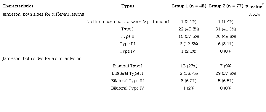 Study data were obtained by retrospective examination and prospective observation methods. Patients’ preoperative characteristics are shown in Table 1. We were based on the Jamieson Surgical Thromboembolic Classification criteria (Table 2). This classification includes type 1, type 2, type 3, and type 4. Type 4 patients were considered inoperable and excluded from the study. One hundred twenty-five patients who were diagnosed with CTEPH in our hospital in 2011 and 2013 and underwent PTE operation were included in the study. Patients were divided into two groups according to the use of crystalloid (Group 1) and colloid (group 2) fluid in the perioperative period.
