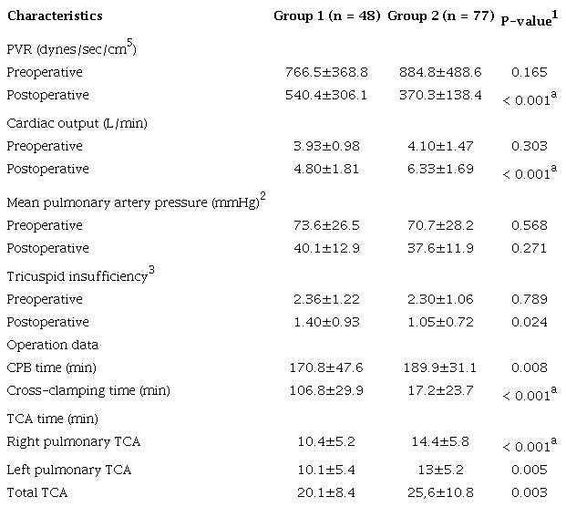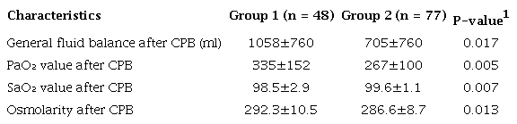 After CPB, in groups, inotrope and intra-aortic balloon pump (IABP) support requirements were statistically different. This difference has been in favor of Group 2. Cardiac output, which is the most critical cardiac performance indicator, was significantly increased in Group 2 patients. Also, the need for inotrope and left ventricular assist device was decreased. These results were evaluated with multivariate analysis of variance. Besides, the dramatic decline of the pulmonary vascular resistance (PVR) was also observed in the two groups. In particular, Group 2 results were statistically significantly lower than Group 1 (Table 4). PVR is a critical predictor for mortality, as Madani et al. have stated in their study[10].