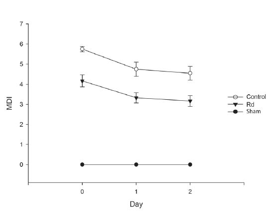 To assess the neuroprotective effects of pretreatment with ginsenoside Rd in rats, hindlimb motor function was evaluated daily using MDI scores. All rats except one in the control group survived until the last neurological evaluation was performed on day two. The MDI scores for each group are shown in Figure 1. In the sham group, all rats demonstrated normal motor function as represented by MDI scores of 0 throughout the entire experimental period. The changes in MDI scores over time were significantly diferent between groups (repeated-measures ANOVA, P=0.002). A significant diference in MDI scores was found between the Rd and control group (Dunnett’s post hoc test, P<0.001). On day zero, the Rd group exhibited significantly lower MDI scores than did the control group (4.17±0.30 vs. 5.75±0.13, P<0.001). This trend continued until 48 hours after reperfusion (day one: 3.33±0.26 vs. 4.75±0.35, P=0.008; day two: 3.17±0.27 vs. 4.55±0.34, P=0.011).