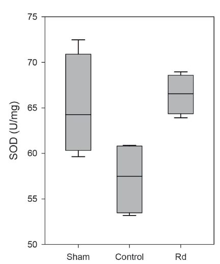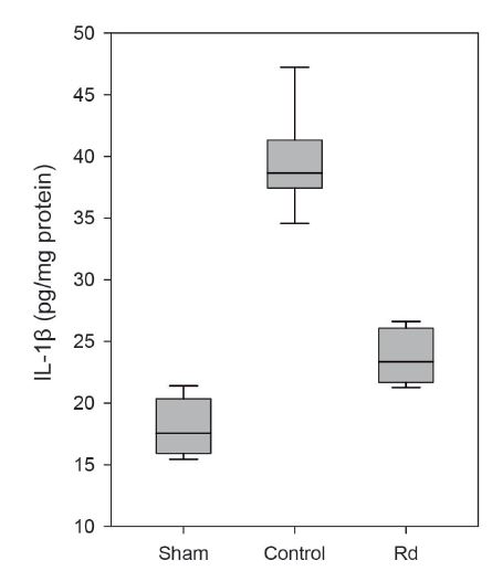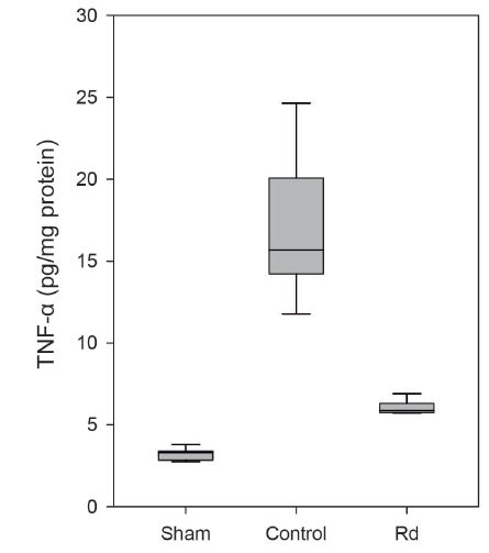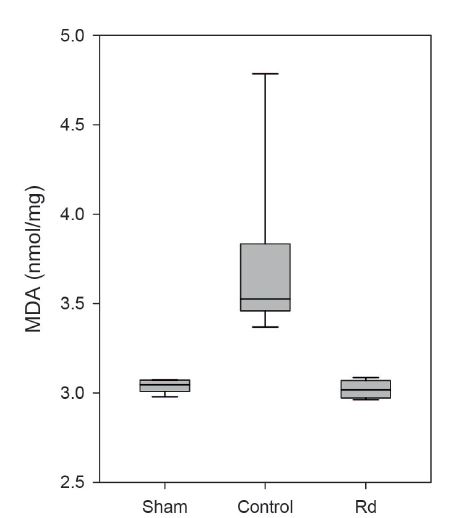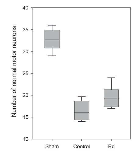 Results: The Rd group showed significantly lower motor deficit index scores than did the control group throughout the entire experimental period (P<0.001). The Rd group demonstrated significantly greater numbers of normal motor neurons than did the control group (P=0.039). The Rd group exhibited decreased malondialdehyde levels (P<0.001) and increased superoxide dismutase activity (P=0.029) compared to the control group. Tumor necrosis factor-alpha and interleukin-1 beta tissue levels were significantly decreased in the Rd group (P<0.001).