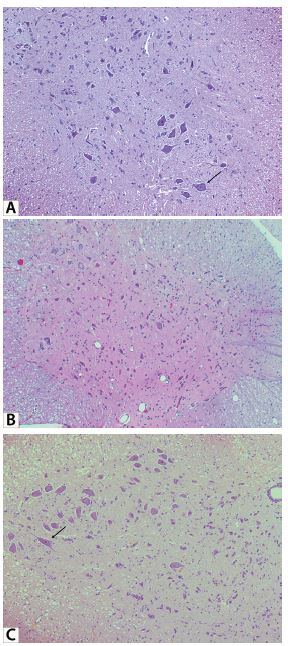 Infammatory markers were evaluated using an ELISA technique. Homogenization of the spinal cord tissues was performed on ice with radioimmunoprecipitation assay bufer. After the centrifugation of the homogenates, the levels of TNF-α and IL-1β in the supernatant were measured using a commercially available ELISA kit (AB100785 and AB100768; Abcam, Cambridge, United Kingdom). The assays were used according to the manufacturer’s protocol. Briefly, antibodies specific to TNF-α and IL-1β were used to coat the microplate kit. The absorbance was spectrophotometrically measured at 450 nm (SpectraMax M2, Molecular Devices, Sunnyvale, California, United States of America). The results were expressed as picograms per milligram (pg/mg) protein.