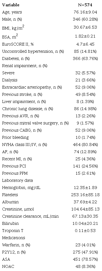 A total of 574 patients were included in the study. Demographic and preoperative characteristics are presented in Table 1. The mean age was 76.2±9 years, 60.28% were male, and severe renal impairment was diagnosed in 5.57% of the patients. Patients over 65 years represented 86.41% of our cohort, and 508 (88.50%) patients were using antithrombotics and anticoagulants.