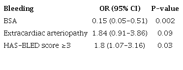 Results: Bleeding occurred in 78 patients (13.59%). HAS-BLED category 3 was a significant predictor of bleeding (OR: 1.99 ]1.18- 3.37], C-index: 0.56, P=0.01). C-index increased to 0.64 after adding body surface area and extracardiac arteriopathy to the model. The Net Reclassification Index showed an increase in the predic tive value of the model by 11.4% (P=0.002). The C-index increased to 0.61 using renal impairment definition based on creatinine clearance. Operative mortality was significantly associated with the HAS-BLED score (OR: 7.54 [95% CI: 2.73- 20.82], C-index: 0.73, P<0.001).