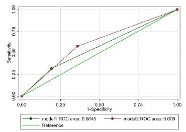 The predictive value of HAS-BLED was retested using the creatinine clearance <50 mL/min as the renal impairment definition (based on EuroSCORE II definition). The C-index increased to 0.61 (95% CI: 0.55-0.67) with the new definition of renal impairment (P=0.09) (Figure 2). The Net Reclassification Index was used to test the change in the predictive value of the HAS-BLED score using both definitions of renal impairment. Renal impairment was added to the other HAS-BLED score components, and the change in the predictive value with each definition was calculated. With a 9% risk of bleeding, there was a 0.2% improvement in the HAS-BLED score when renal impairment was added using the original definition (P=0.84), and the improvement was 3.8% with the definition of creatinine clearance (P=0.07).