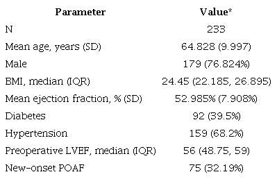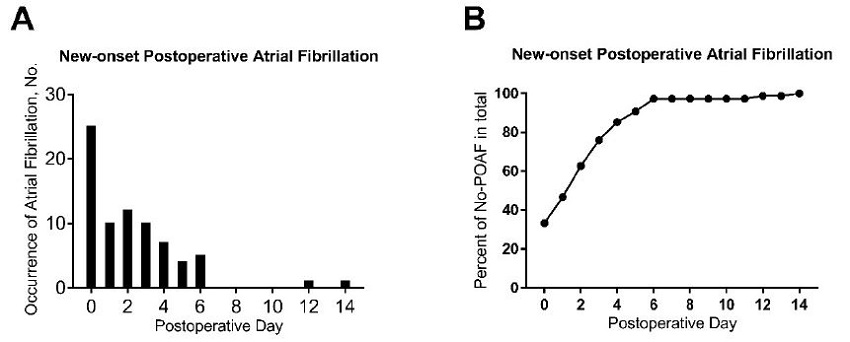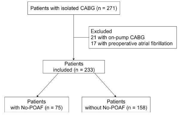 Methods: Retrospective observational case-control study of 233 patients undergoing isolated off-pump CABG surgery between August 2018 and July 2020 at the Department of Thoracic and Cardiovascular Surgery, the Affiliated Drum Tower Hospital of Nanjing University Medical School. Associations between predictor variables and new-onset POAF were identified. The main outcome was new-onset POAF after CABG surgery.