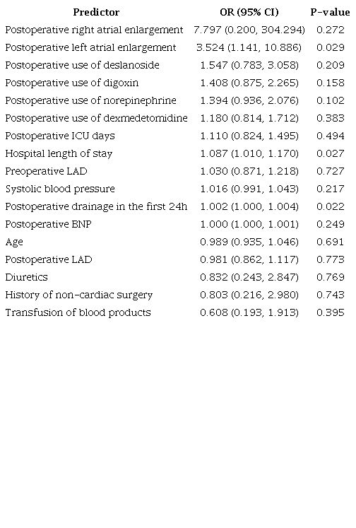 Results: A total of 75 (32.19%) patients developed new-onset POAF after CABG surgery. The new-onset POAF patients had advanced age, higher baseline systolic blood pressure, more preoperative use of diuretic drug, more transfusion of blood products, atrial dilation and postoperative positive inotropic drug treatment. Nineteen variates entered the multivariable logistic regression model with a Hosmer-Lemeshow test score of 7.565 (P=0.477). Postoperative left atrial enlargement, postoperative drainage in the first 24 hours and total length of hospital stay were statistically significant, while postoperative right atrial enlargement (OR and 95% CI, 7.797 [0.200, 304.294], P=0.272) and left atrial enlargement (3.524 [1.141, 10.886], P=0.029) assessed by echocardiography had the largest OR value.