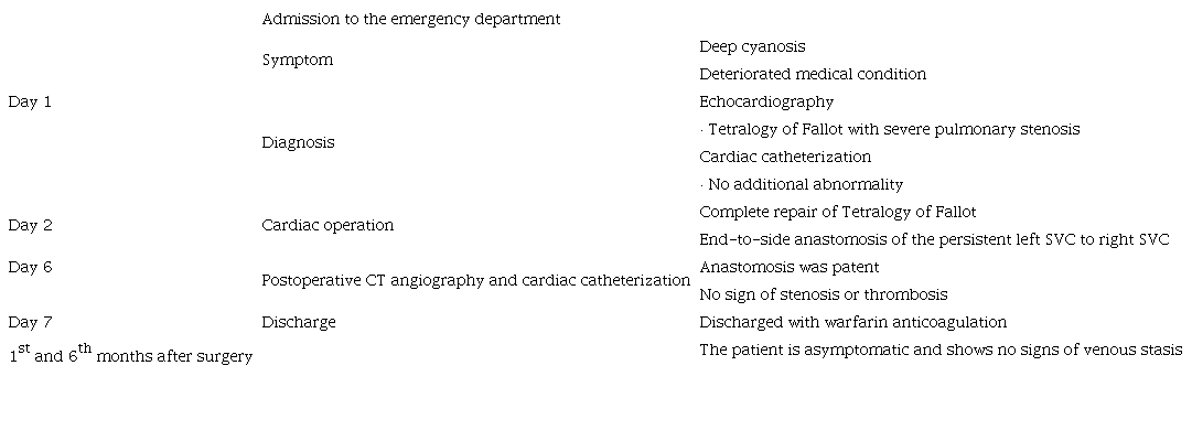 In our patient, we preferred to perform an end-to-side direct anastomosis of the PLSVC to the right SVC for the following reasons:[1]the accurate diagnosis of the patient was confirmed during the cross-clamping period[2], and the possibility of performing the anastomosis after complete repair and during the rewarming period on the beating heart[3]. We had some concerns regarding the possible complications of intra-atrial baffle formation and extracardiac graft interposition techniques. In previous studies, it has been reported that the long-term patency of intra-atrial baffle formation is questionable due to the use of non-growing material and that it may become stenotic. Beside this, due to the lack of growth potential, extracardiac graft interposition is also not applicable for young children[1,4]. In addition, these grafts may be compressed between the sternum and the aorta.