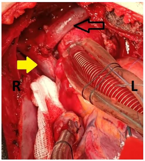 Due to the concern that the ischemic time would increase, we decided to divert the PLSVC drainage to the systemic venous system via an extracardiac route. Complete repair of the tetralogy of Fallot was performed with a transannular patch. Following cross-clamp removal, the PLSVC was transected from the left atrium, and all its proximal branches were ligated and divided under cardiopulmonary bypass support. Then the proximal part of the right SVC was dissected entirely free. The PLSVC was redirected to the right side over the anterosuperior aspect of the ascending aorta, and end-to-side anastomosis to the right SVC was performed. (Figure 1). No kinking or tension was observed on the suture line of the anastomosis.