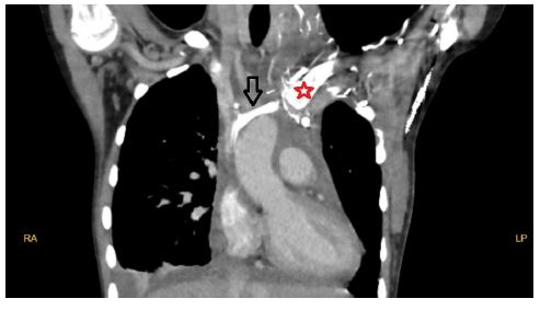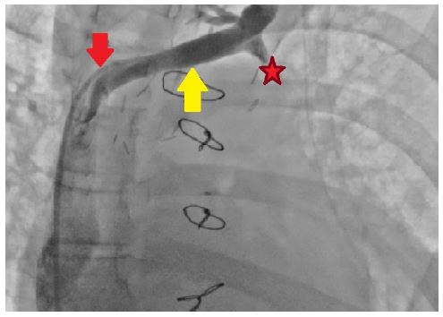 Computed tomography angiography and cardiac catheterization prior to discharge showed that the PLSVC and the anastomosis were patent, and there was no sign of stenosis or thrombosis (Figures 2 and 3). Postoperative recovery of the patient was uneventful, and the patient was discharged with warfarin anticoagulation on the postoperative 5th day without any complications.