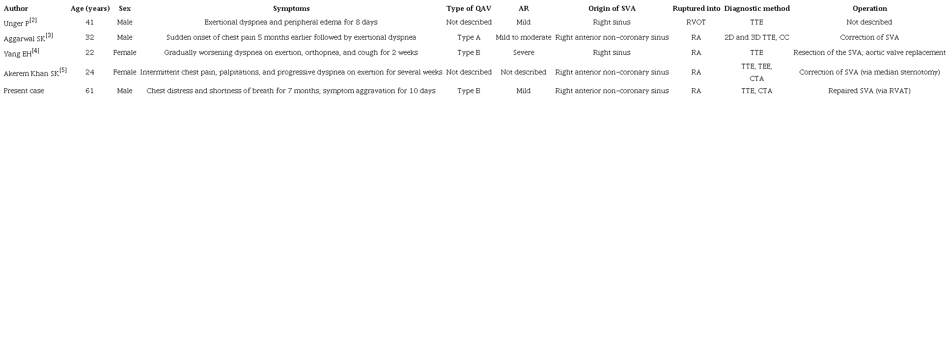 Among the five cases described in Table 1, the surgical treatment can be classified into two categories. Aortic valve replacement and resection of SVA were done in one patient with severe aortic regurgitation, while simple correction of SVA was performed in four patients with mild to moderate aortic regurgitation. The surgical indication for QAV depends on the severity of aortic regurgitation; however, surgical management of SVA is essential once it is diagnosed.