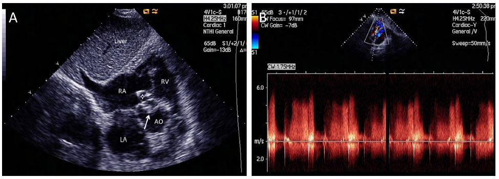 A 63-year-old Chinese man presented with a history of shortness of breath and chest distress for seven months. His symptoms had aggravated in the last 10 days. His past medical history was unremarkable. Physical examination revealed a 3/6 diastolic murmur at 2-4 intercostal spaces along the left sternal border. Chest X-ray showed severe pulmonary emphysema. Electrocardiography (ECG) findings were normal. Because of pulmonary emphysema, TTE provided only limited findings; we obtained the images from the subcostal window instead of parasternal windows. The size of the left and right ventricles was normal, left ventricular ejection fraction was 61%, and diastolic function of the left ventricle was impaired in stage I. Subcostal short axis view showed thickening of aortic valve leaflets with mild aortic regurgitation; however, the number of aortic cusps could not be determined. Color Doppler revealed windsock deformity with a shunt from the accessory aortic cusp to the right atrium during systole and diastole. The velocity of the shunt was 5.7 m/s (Figure 1). Transesophageal echocardiography (TEE) was refused by the patient.