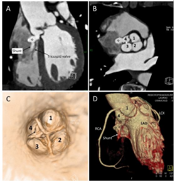 As part of chest distress evaluation and to rule out any associated coronary artery disease, an ECG-gated CTA scan was performed using dual-source computed tomography (SOMATOM definition, Siemens, Forchheim, Germany) with ECG-gated tube current modulation (tube voltage: 100 kV; full tube current was applied from 30% to 75% of the R-R interval). It revealed a QAV with three equal-sized cusps and a smaller accessory cusp (Figure 2). All the aortic valve leaflets were thickened, especially the accessory one, which was located between the right coronary sinus and the non-coronary sinus with mild calcification at its irregular margin. Different types of reconstruction, including multiplanar reconstruction, volume rendering, and virtual endoscopy, indicated a windsock fistulous connection between the accessory cusp and the right atrium, which projected along and just above the septal leaflet of the tricuspid valve. The windsock was 14 mm in length and 7 mm in width, with a 5-mm crevasse underneath. There was a diastolic shunting through the windsock into the right atrium, which appeared as a jet of blood with greater contrast material extending from the aorta into the right atrium (Figure 2). Nevertheless, the images reconstructed in systole demonstrated that the left-to-right shunt was less than in diastole, possibly due to the obstruction of the corresponding opened aortic valve leaflet. Multiphase reconstructed imaging indicated that the flow through the communication was predominately diastolic; however, some flow persisted during systole. Coronary arteries were normal with no plaque or deformity (Figure 2).