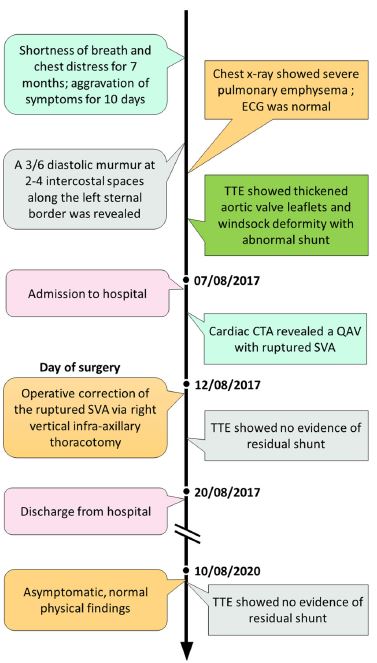 QAV and SVA are rare congenital anomalies. To the best of our knowledge, only four case reports describing the unusual association between QAV and ruptured SVA have been published[2-5]. Our patient is the first such documented Chinese patient who was diagnosed by TTE and CTA; the operation was successfully performed by a minimally invasive approach.