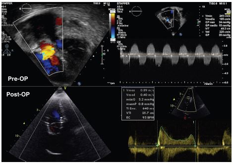 The patient remained in the intensive care unit for the first 24 hours, being discharged 4 days after admission, with improvement in the right heart failure symptoms, and on warfarin therapy for three months and antiplatelet therapy after completing the three months of anticoagulation. Two years later, the valve continues to perform well, without stenosis (mean gradient 2 mmHg) or regurgitation, and the patient is asymptomatic (NYHA I).