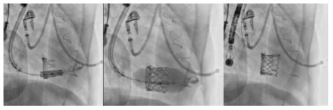 Given the small size of our patient, with a small part of the sheath inside him, short distance and sharp curve between the sheath and the target, and an adequate diameter of the jugular vein, anticipating the possibility of difficulties in this step, we preferred to use a 14F eSheath, allowing to mount the Sapien valve on the balloon outside the patient, and reducing manipulation inside him.