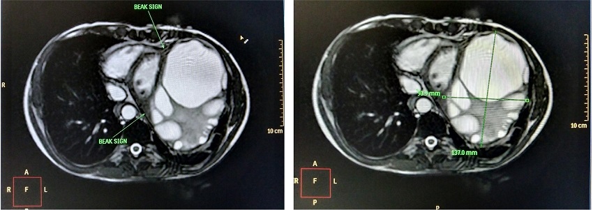 Cardiac magnetic resonance imaging (MRI) was done in order to delineate the extent and tissue penetration. MRI showed “beak sign” on the medial side of cyst indicating its myocardial origin and attenuated left ventricular wall thickness of 6-7 mm at the thinnest portion and 11-12 mm at the thickest portion. Reduction in left ventricular volumes was also noted (Figure 1). Coronary angiography was done to look for distortion of coronary anatomy and feeder vessel (if any) to the cyst, but it revealed normal epicardial coronaries. Immunoglobulin G echinococcal antibodies were found to be 16.8 units.