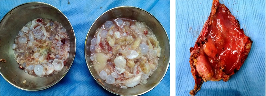 After two weeks of prior albendazole therapy, the patient was prepped for surgery. Sternotomy was done, and, as anticipated, the pericardium was found adherent to whole epicardial surface (Figures 2A and 2B). Adhesions were dissected superiorly and inferiorly. Due to dense adhesions over the lateral epicardial and cystic surface, left pleura was opened, and the cyst was approached from the lateral side (Figure 2C). Whole left lung and epicardial surfaces were covered with 10% betadine-soaked sponges. Purse string sutures were placed over the aorta. The cyst was punctured with 18 gauze needle syringe, and around 100 ml of clear fluid was aspirated to partially decompress the cyst initially. After confirmation, the cyst was incised over the same portion, and fluid was sucked out directly without spillage into the nearby surgical field. Stay sutures were placed over the cyst wall followed by removal of daughter cysts, cystic fluid, and inner layer of cyst (Figure 2D). Cavity was kept filled with betadine solution for two minutes. After removal of betadine, the lateral cystic wall was excised. Sponges were removed, and the whole pleural and pericardial cavity was washed with 1% betadine solution. Cyst wall and contents were sent for histopathology which showed eosinophilic lamellated cyst wall with presence of scolices and hooklets (Figure 3). The cyst wall showed marked fibrosis and dense chronic inflammation and congestion.