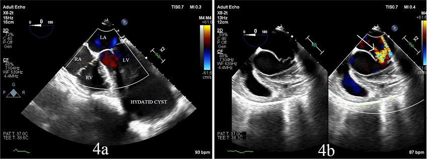 After resection, echocardiography showed moderate mitral regurgitation possibly due to decompression of the ventricular cavity, but the patient remained hemodynamically stable (Figure 4). Postoperatively, the patient had mild mitral regurgitation. He was placed on albendazole for two months after discharge. After three months of follow-up, the patient is clinically stable and has mild mitral regurgitation on echocardiography (Figure 5).