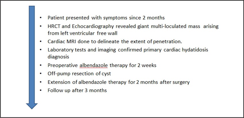 In conclusion, primary hydatid cyst of the heart, specifically the intramural type, is rare. Detailed and meticulous assessment should be considered in large ventricular hydatid cyst in order to delineate the extent and to choose the surgical strategy with lesser risks and invasiveness. We are reporting this case to underline that cardiac hydatidosis can be addressed with off-pump technique approach as compared to empty beating on-pump technique and thereby reducing the risk of anaphylaxis and CPB-related effects.