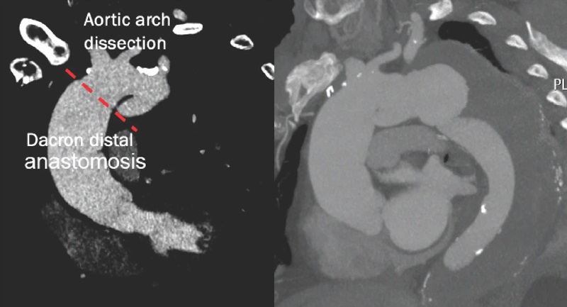 A 71-year-old male patient presenting acute Stanford type A aortic dissection had undergone an open ascending aorta replacement under cardiopulmonary bypass through right axillary artery cannulation 10 years ago. In the late postoperative course, he developed a sternal surgical wound infection, and some steel wires had to be removed. At the begging of 2022, he presented a sudden severe upper back pain, alleviated 24 hours after painkillers administration and arterial pressure and heart rate control. At this point, he was transferred to our tertiary hospital with a computed tomography angiography showing a huge aortic arch aneurysm (76 mm) and an aortic tear starting close to the distal anastomoses of the ascending aorta with the Dacron® graft, in the inner aspect of the aorta curvature (Figure 1). All the main arterial branches but the left renal artery originated from the true lumen. After institutional heart team discussion, taking into consideration the high risk of a redo open cardiac surgery, an endovascular approach was chosen.