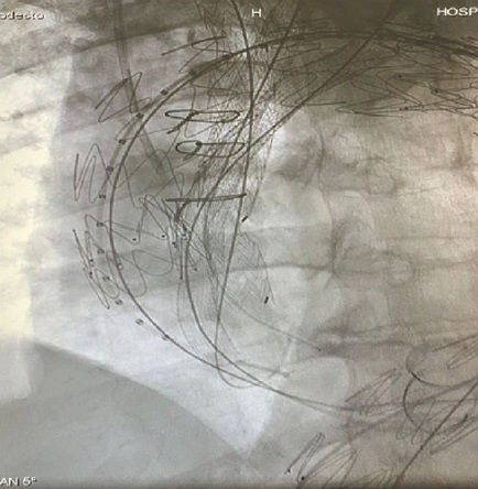 Under general anesthesia, both axillary arteries and the left common carotid artery were totally percutaneously accessed with ultrasound-guided punctures, and Perclose/ProGlide™ suture-mediated closure devices (Abbott Vascular Devices, Redwood City, California, United States of America) were employed (Figure 2). After systemic heparinization (100 IU/Kg, activated clotting time > 300 seconds), a 12F sheath was placed into the right and left axillary arteries, and an 11F sheath into the left common carotid artery. Hydrophilic stif guidewires (0.035 mm) were placed through the sheaths into the ascending aorta and left in situ. Then, VIABAHN® stent (GORE® VIABAHN® endoprosthesis; Gore, Flagstaf, Arizona, United States of America), with 100 and 150 mm in length, were positioned from the left common carotid and left subclavian arteries until the tip of the stents reached the ascending aorta. A 16×135 mm branched stent graft (GORE® EXCLUDER® Contralateral leg endoprosthesis) was inserted through the right axillary artery, positioned from the brachiocephalic trunk into the ascending aorta. An angiographic pigtail catheter was inserted through a 6F right femoral sheath, and a control angiography was performed. Then, a 46-42×233 mm thoracic endovascular graft (Cook Zenith Alpha™; Cook Inc., Bloomington, Indiana, United States of America) was advanced through a Lunderquist® guidewire (Cook) placed in the left ventricle from the left femoral artery access (Figure 3). All the grafts and stents were delivered at the same time. Finally, a second 44×233 mm thoracic endovascular graft (Cook Zenith Alpha™) was positioned and deployed distally to the previous one, to extend the distal thoracic aorta covered zone. Two additional stents, with 100 and 80 mm in length, were deployed in the left subclavian and in the left common carotid artery, respectively. The reason to use a second stent was the unavailability of longer VIABAHN® in an urgent context, demanding two stents to achieve the final required length. Final control angiography confirmed the complete exclusion of the aortic arch dissection and proper flow through all the supra-aortic branches (Figure 4). The patient was extubated in the operating room, had no neurologic complications, and was discharged 10 days after the procedure. Computed tomography angiography performed one week later showed complete exclusion of the aortic arch dissection.