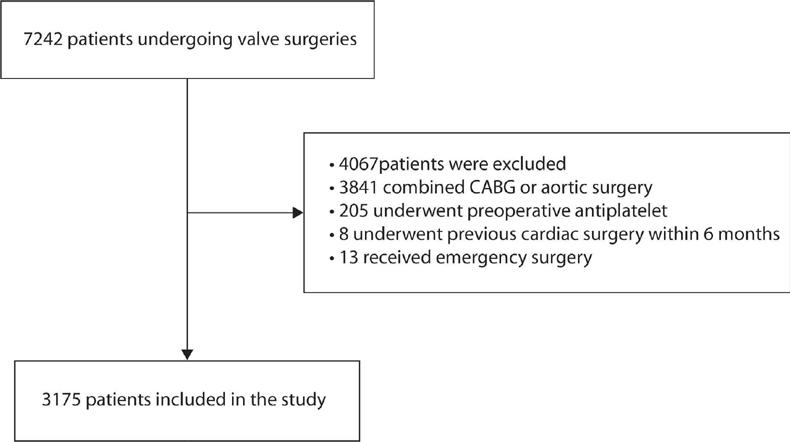 Risk factors of postoperative thrombocytopenia were assessed. Variables contained demographic information, body surface area (BSA), comorbidity, European System for Cardiac Operative Risk Evaluation (EuroSCORE), preoperative laboratory tests, surgical information (including valve position, valve numbers, valve replacement or repair, and mechanical or bioprosthetic valve), CPB circuit, CPB time, aortic cross-clamping time, CPB temperature, and total heparin dose.