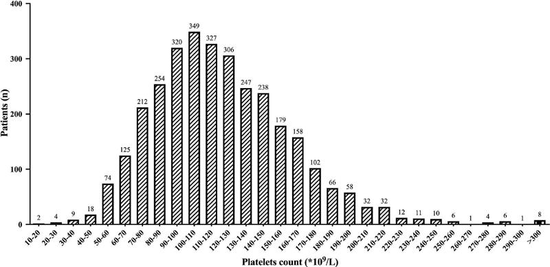 According to the inclusion and exclusion criteria, 3,175 patients were enrolled (Figure 1). The mean age was 54 years, and 1,735 (54.6%) were male. More than half of the patients’ first postoperative platelet counts were < 125×109/L (reference value in normal healthy individuals), 10% were < 75×109/L, and 1% were < 50×109/L. The 10th, 25th, 50th, and 75th quantile of postoperative platelet count were 75×109/L, 94×109/L, 117×109/L, and 146×109/L, respectively (Figure 2). The threshold for postoperative thrombocytopenia was defined as 75×109/L. The incidence of postoperative thrombocytopenia was 10.2% (n=324), and 85% of the patients had platelet recovery at hospital discharge.