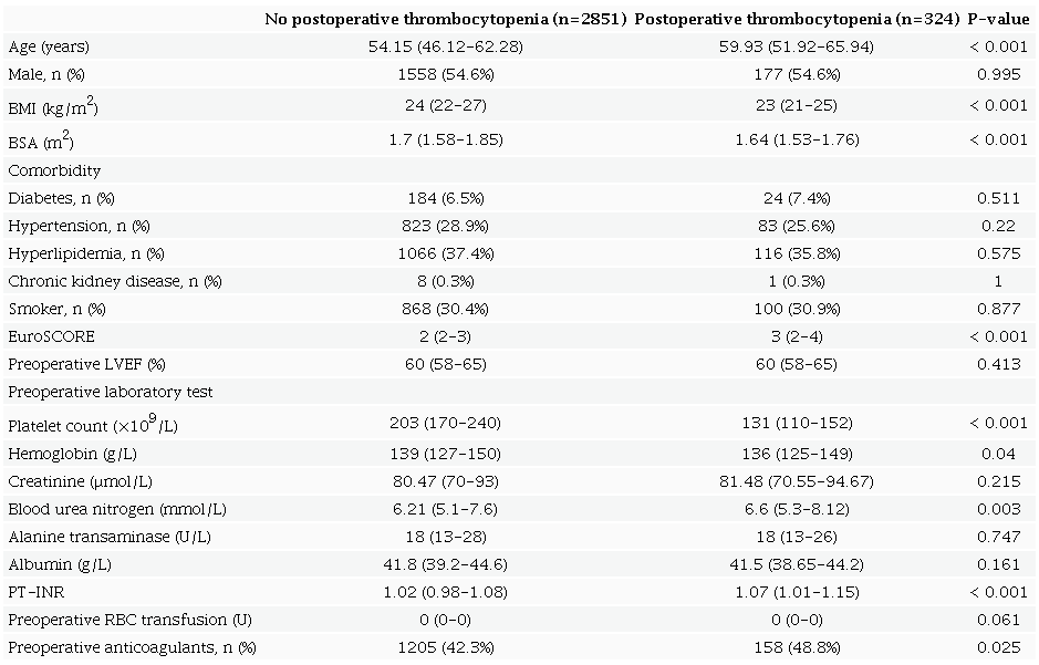 Patients with postoperative thrombocytopenia were older (59.93 [51.92-65.94] vs. 54.15 [46.12-62.28] years, P<0.001), had lower body mass index (23 [21-25] vs. 24 [22-27] kg/m2, P<0.001), smaller BSA (1.64 [1.53-1.76] vs. 1.7 [1.58-1.85] m2, P<0.001), higher EuroSCORE (3 [2-4] vs. 2 [2-3], P<0.001), lower preoperative platelet count (131 [110-152] vs. 203 [170-240] × 109/L, P<0.001), lower preoperative hemoglobin level (136 [125-149] vs. 139 [127-150] g/L, P=0.04), higher BUN (6.6 [5.3-8.12] vs. 6.21 [5.1-7.6] mmol/L, P=0.003), and higher INR (1.07 [1.01-1.15] vs. 1.02 [0.98-1.08], P<0.001) level (Table 1).