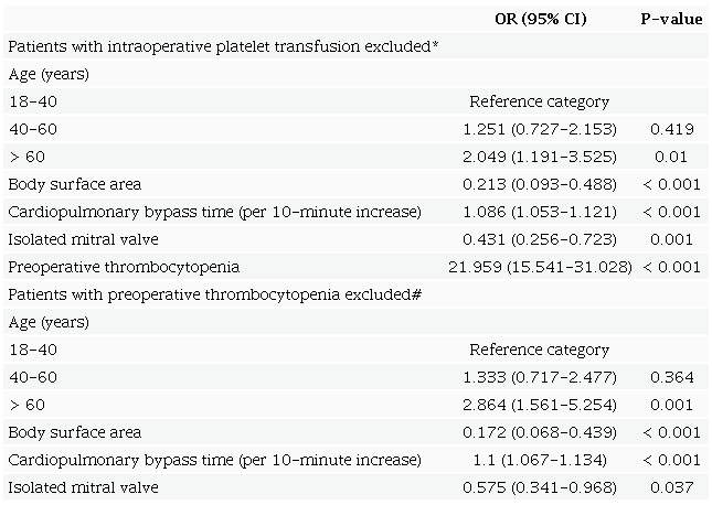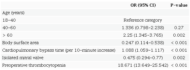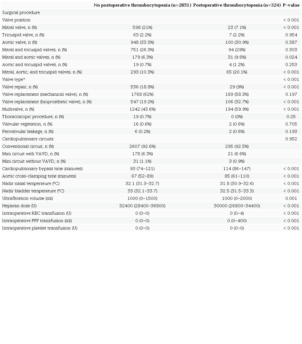 Results: The 10th quantile of all enrolled patients (75×109/L) was defined as the threshold for postoperative thrombocytopenia. In-hospital mortality was comparable between thrombocytopenia and non-thrombocytopenia groups (0.9% vs. 0.6%, P=0.434). Patients in the thrombocytopenia group had higher rate of postoperative blood transfusion (5.9% vs. 3.2%, P=0.014), more chest drainage volume (735 [550-1080] vs. 560 [430-730] ml, P<0.001), and higher incidence of acute kidney injury (12.3% vs. 4.2%, P<0.001). Age > 60 years (odds ratio [OR] 2.25, 95% confidence interval [CI] 1.345-3.765, P=0.002], preoperative thrombocytopenia (OR 18.671, 95% CI 13.649-25.542, P<0.001), and cardiopulmonary bypass time (OR 1.088, 95% CI 1.059-1.117, P<0.001) were positively independently associated with postoperative thrombocytopenia. Body surface area (BSA) (OR 0.247, 95% CI 0.114-0.538, P<0.001) and isolated mitral valve surgery (OR 0.475, 95% CI 0.294-0.77) were negatively independently associated with postoperative thrombocytopenia.