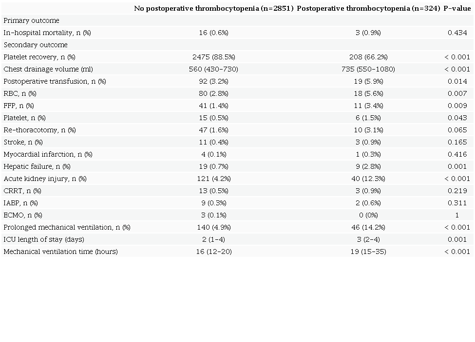 Outcomes were compared between patients with and without postoperative thrombocytopenia. The primary outcome was in-hospital mortality. Secondary outcomes included chest drainage volume, postoperative blood transfusion, re-thoracotomy, platelet count recovery, cerebrovascular accidents (defined as the diagnosis of stroke or intracranial hemorrhage), AKI (defined as a postoperative increase in serum creatinine levels to more than two times baseline within a month or to > 354 mmol/l postoperatively), postoperative myocardial infarction (defined as an increase in creatine kinase to > 240 IU/l within 48 hours postoperatively), intraaortic balloon pump, and extracorporeal membrane oxygenation, mechanical ventilation time, and ICU length of stay. The postoperative red blood cell transfusion threshold was 8 g/L. Platelets were transfused when the level was < 50×109/L. Fresh frozen plasma was transfused at excessive bleeding/chest drainage circumstances, with laboratory evidence suggesting coagulopathy.